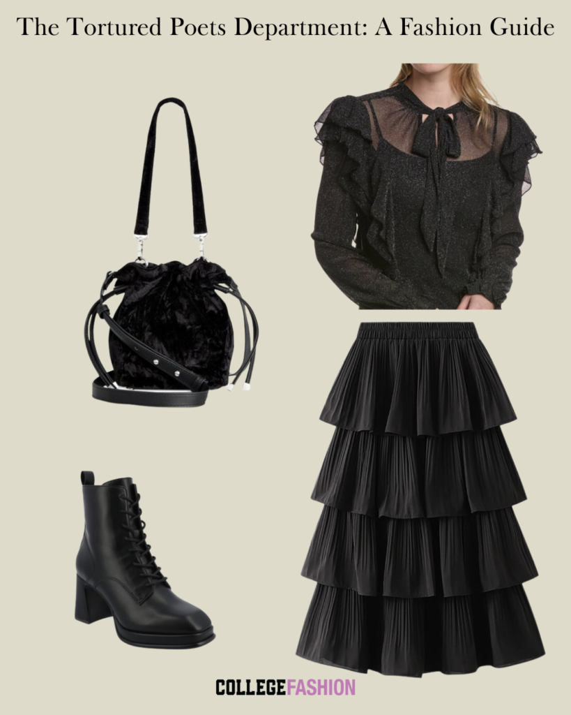 To create a modern/wearable version of this, start with a shimmery black blouse with a high neck and ruffles. Then, for the bottoms, go for a ruffled black skirt with an A-line fit.