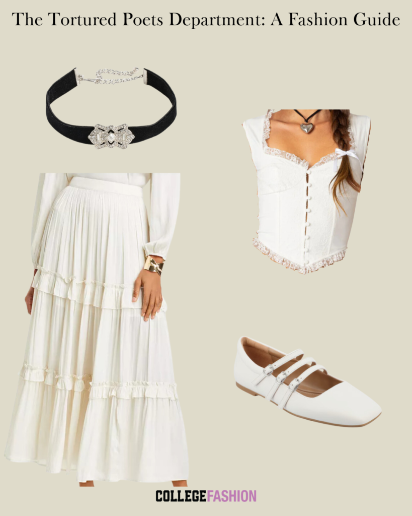 To create a similar look, start with a white corset top and pair it with a white tiered skirt in a midi length. (These skirts are trending like crazy this season!)
