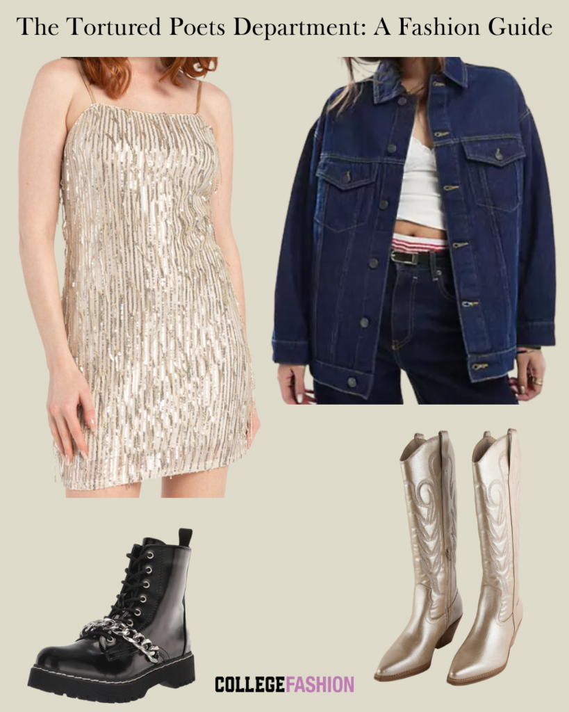 Products: Sequin Dress, Denim Jacket, Combat Boots, Cowboy Boots