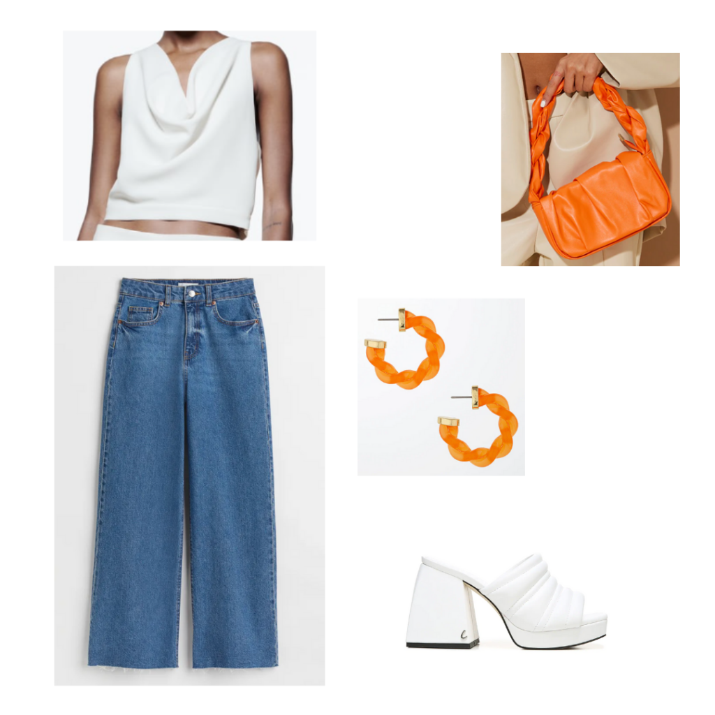 Here, I styled the jeans with this white flowy cropped tank top and some white chunky heeled sandals. I finished off the look with some fun orange earrings and this cute orange bag with a braided handle detail.